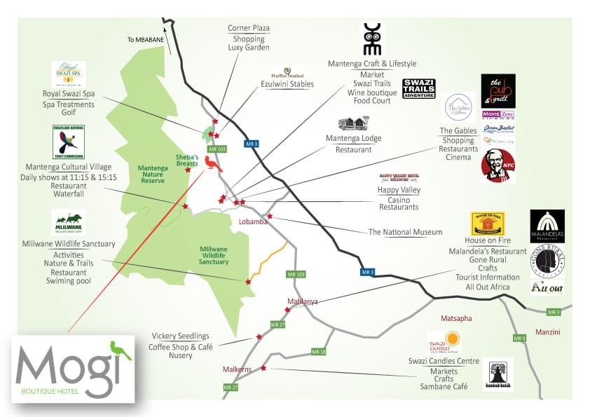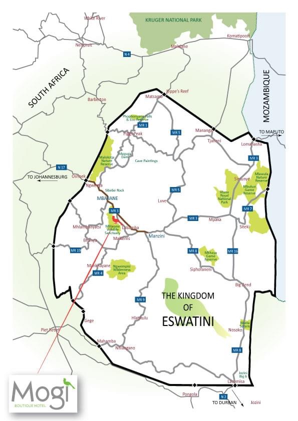 Directions: Come through Oshoek Border Post and stay on the high way, by pass Mbabane, as you get to the bottom of the Malagwane ( a steep and long noticeable pass) take the first off ramp left, signed to: Ezulwini/Hotels/Casino etc, MR103. Turn right across the bridge over the high way. Keep straight on this road. Straight over 2 small roundabouts, past the Royal Swazi Sun on your right, past MTN head office on your left, you’ll get to a large roundabout, go straight over and you will turn (at our sign) 200m past the roundabout on your right (next to “Lidwala” and “All out Africa”). Follow the signs up the hill. We are 300m off the main road